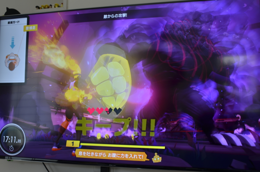 負荷をアップさせたので、エクササイズによってはかなりきつくなりますが、これは頑張りどころです。ゲーム中は敵からの攻撃に腹筋を使ったガードがあって、この回数が多くて参ります。