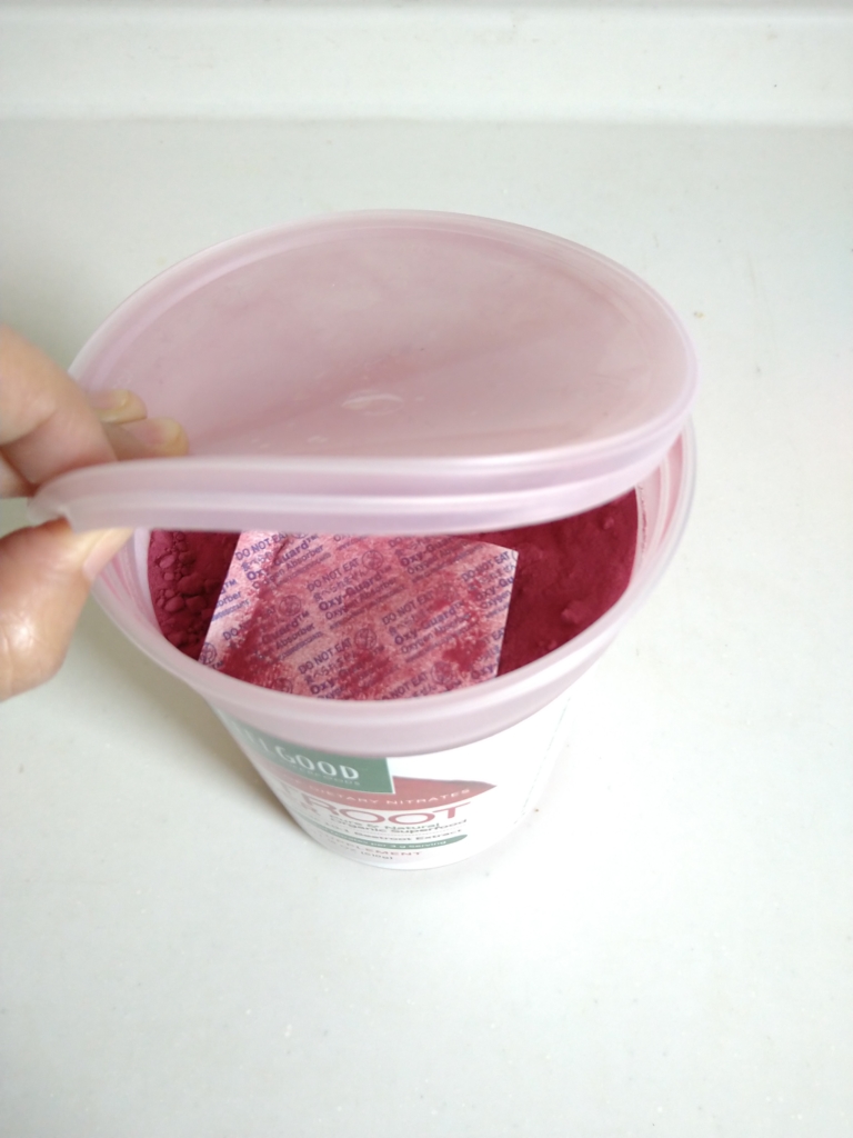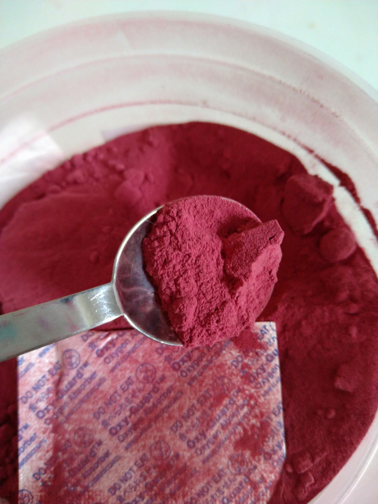 このパウダーの使い道ですが、私の様にそのまま摂取が目的の人と、料理の色付け目的の人がいるようです。クッキーやパンの生地に練り込めば、綺麗なピンク色のクッキーやパン、ポテトサラダなんかが出来上がります。そんな使い方をすると無くなるのも早そうですね。