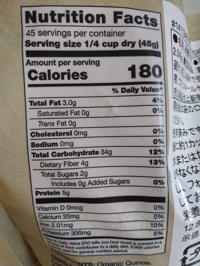 コストコのオーガニックキヌアの栄養成分表示