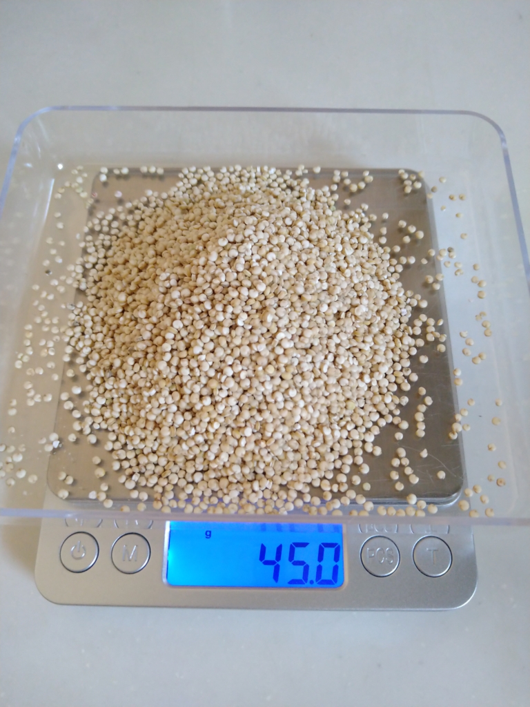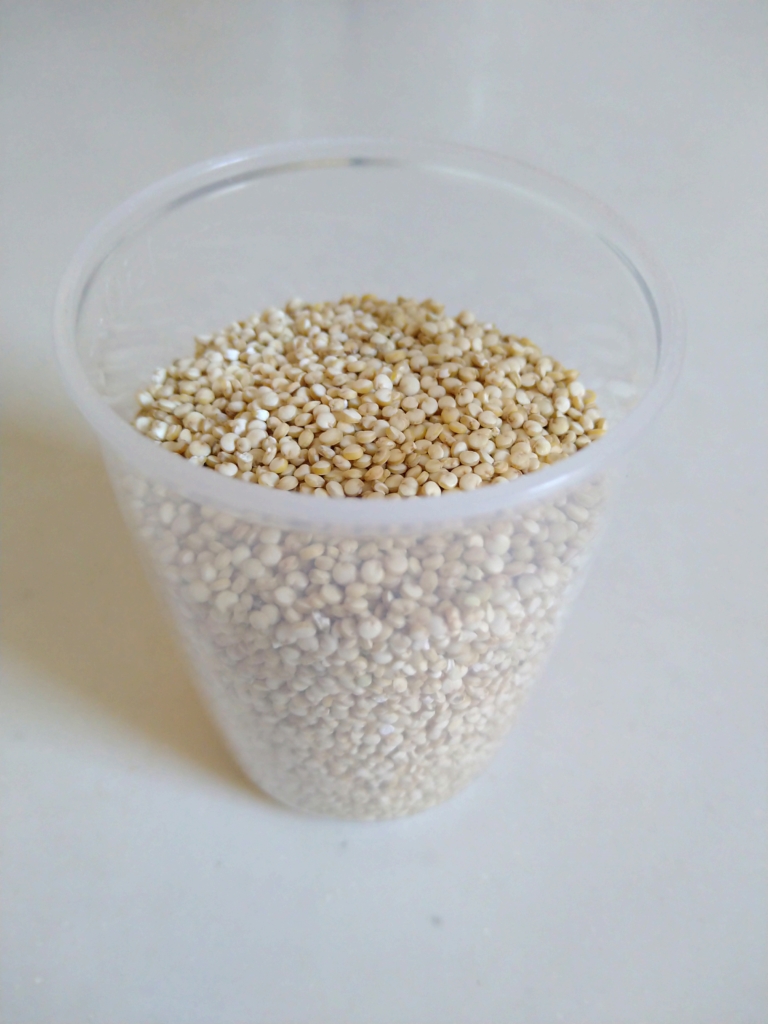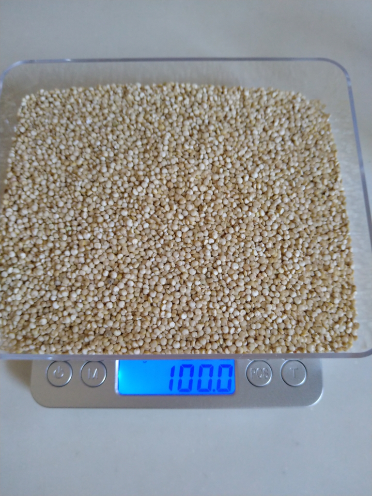 内容量が多いので心置きなく使えるし、このキヌアは有機で洗浄済みなので、手間なく調理する事が出来てすごく便利です。で、どれくらいをどうやって食べているのか、まず100gってどれくらいでしょうか。