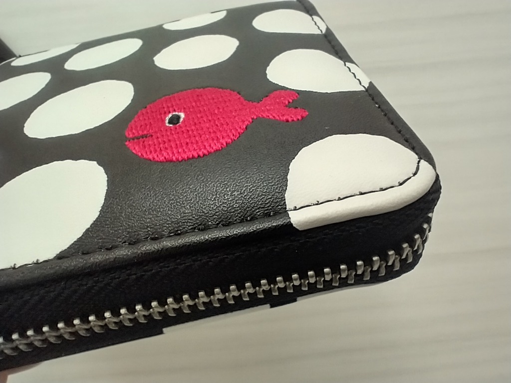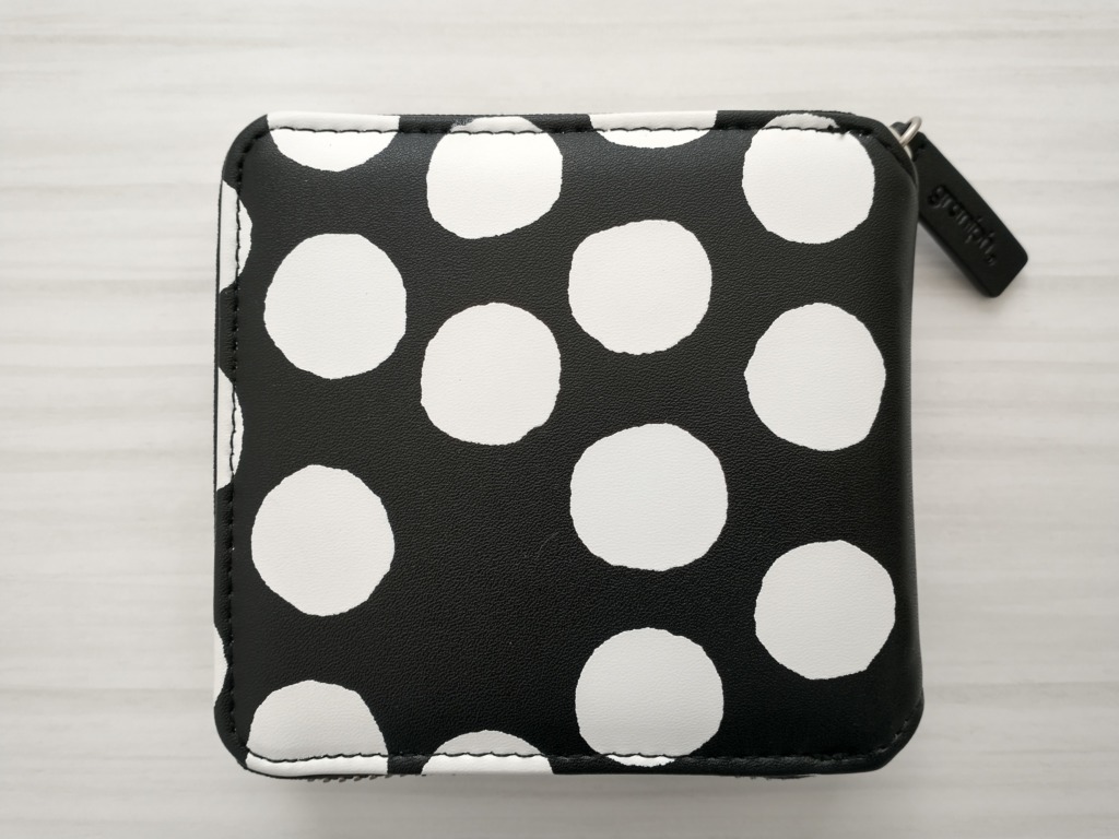 外側は黒に白水玉なのですが、ジッパーを開けた中は少し青っぽい色になっています。