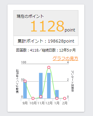 もう12年以上継続しているアンケートサイトです。累計ポイントは19万以上、20万ポイント到達までもうすぐです。1ポイント = 1円 ですので、19万円獲得したという事になります。